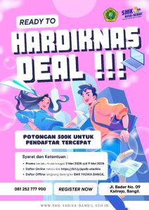 Dalam rangka memperingati Hari Pendidikan Nasional (Hardiknas), SMK Yadika Bangil menghadirkan promo spesial untuk calon peserta didik baru! Dapatkan potongan biaya sebesar 500 ribu rupiah untuk pendaftar tercepat.